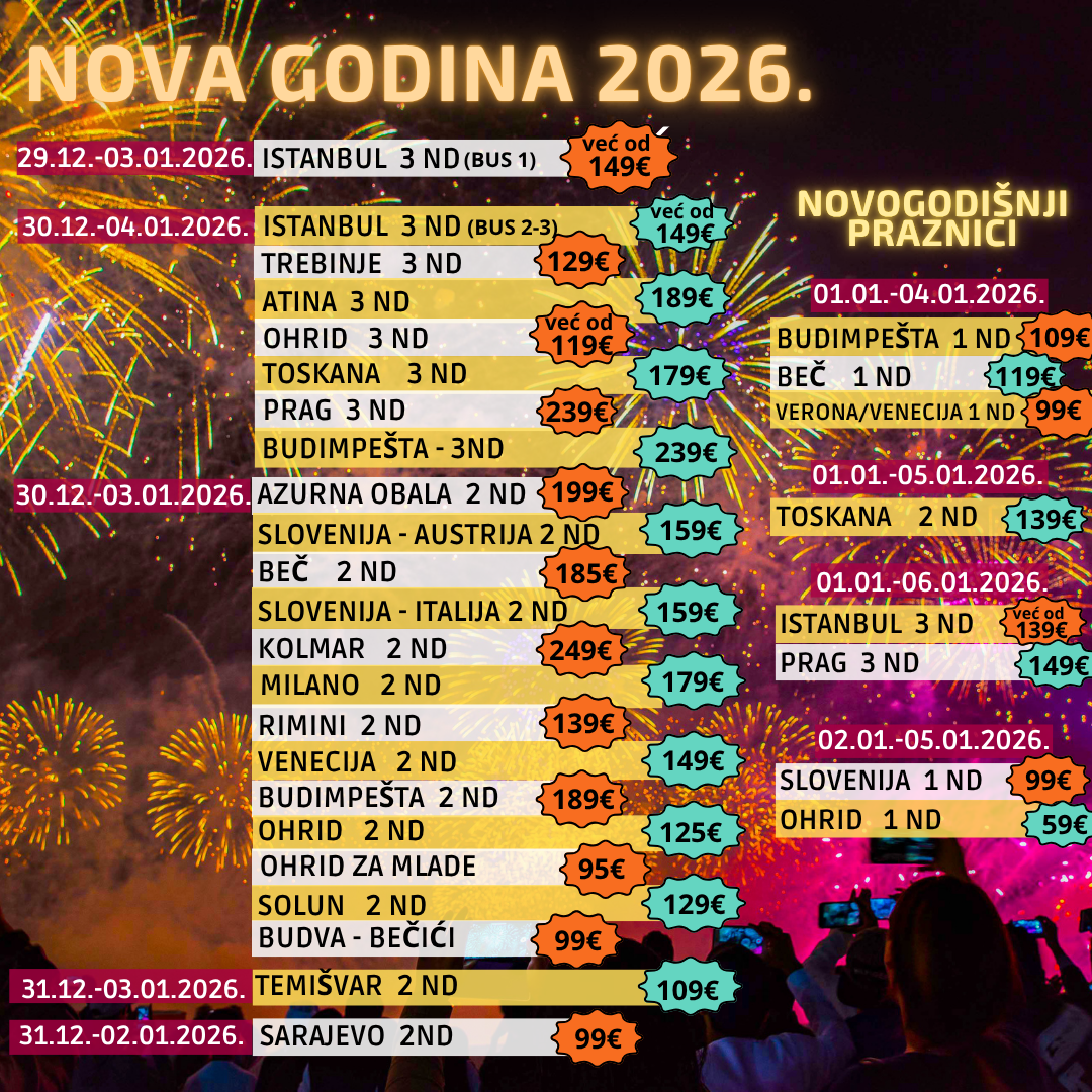 | 30.12.-04.01.2026.» prijave u toku « | 3 NOCENJA SA DORUCKOM | Boss Boutique 4*————Breeze Boutique 4*————International Atene 4*————- | 189€ | 185€ |